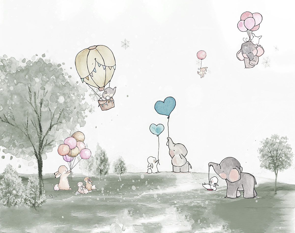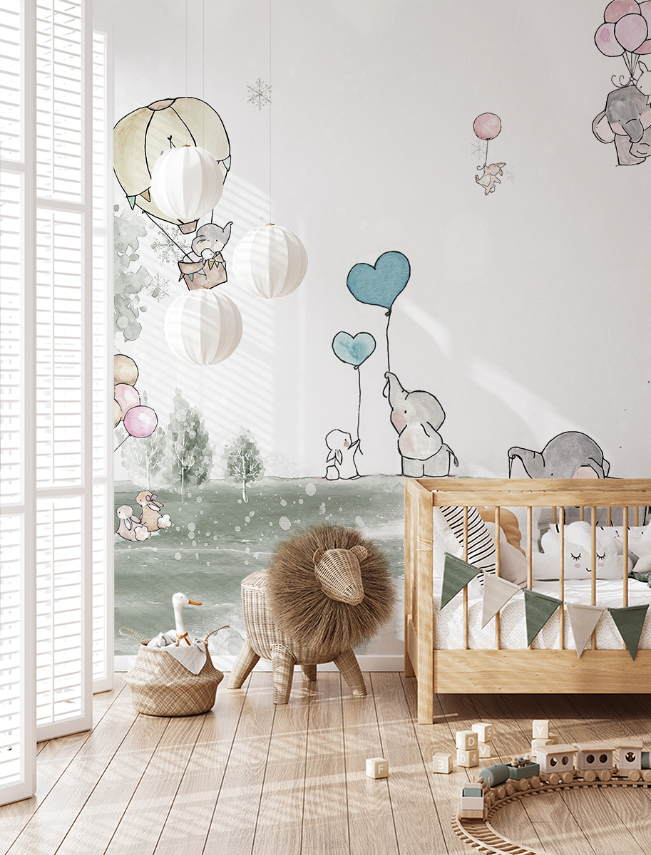 Wprowadź do swojego domu wyjątkowy klimat dzięki fototapecie „Bajkowy spacer pod balonami”. Ten uroczy, akwarelowy wzór z motywem słoników, króliczków i unoszących się balonów tworzy ciepłą, pogodną atmosferę pełną dziecięcej wyobraźni i delikatnego uroku. Subtelne kolory, miękkie pociągnięcia pędzla i przestrzenna kompozycja nadają całości lekkości oraz spokoju.