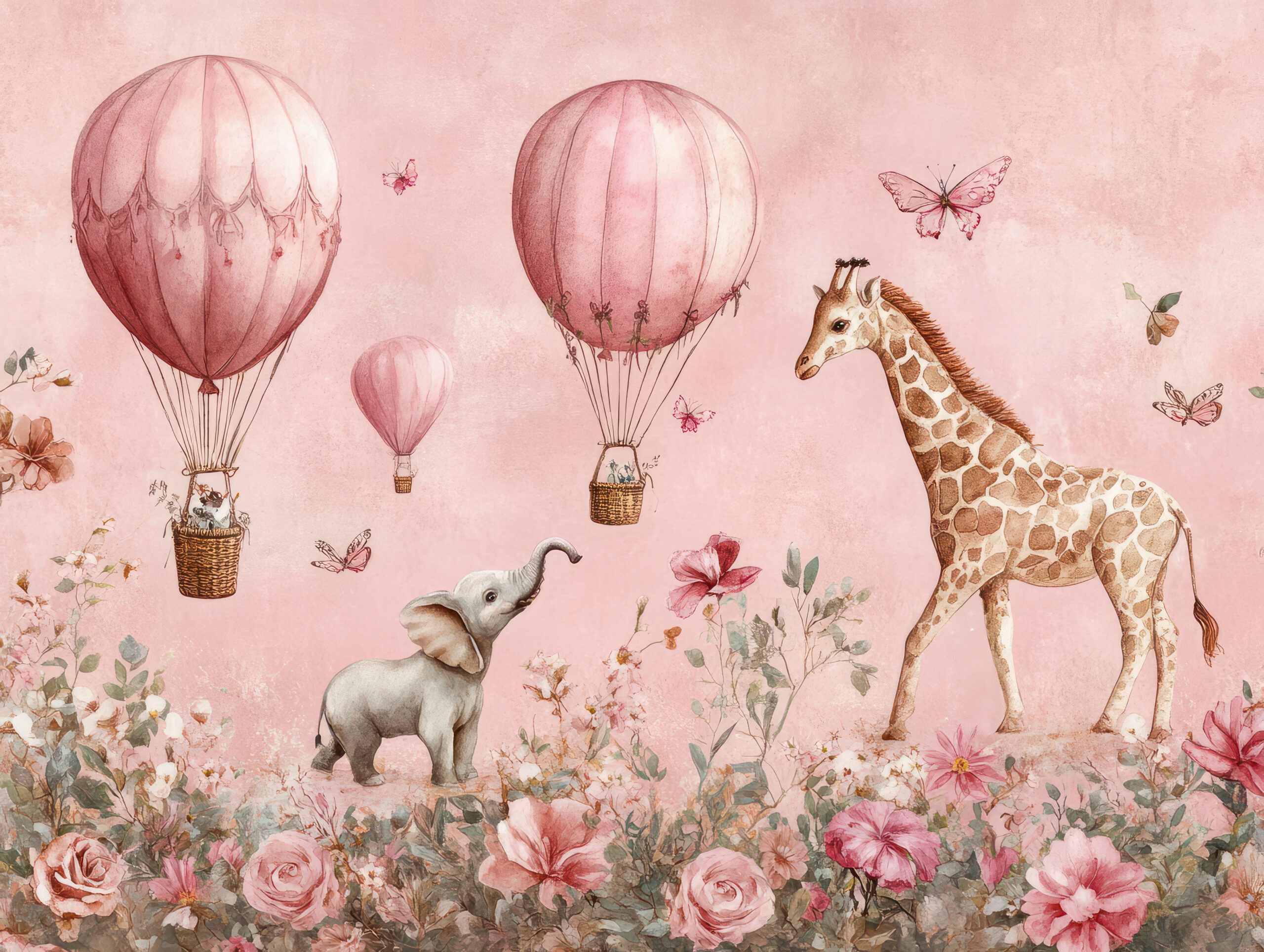 Wprowadź do pokoju swojego dziecka magiczny klimat dzięki fototapecie „Balonowe Safari”. Ta urocza i delikatna ilustracja przedstawia słoniątko i żyrafę otoczone różowymi balonami i kwiatami, które przenoszą maluchy w świat pełen zabawy i fantazji. Pastelowe kolory oraz przyjazne zwierzątka tworzą ciepłą, przytulną atmosferę, idealną do dziecięcej przestrzeni.