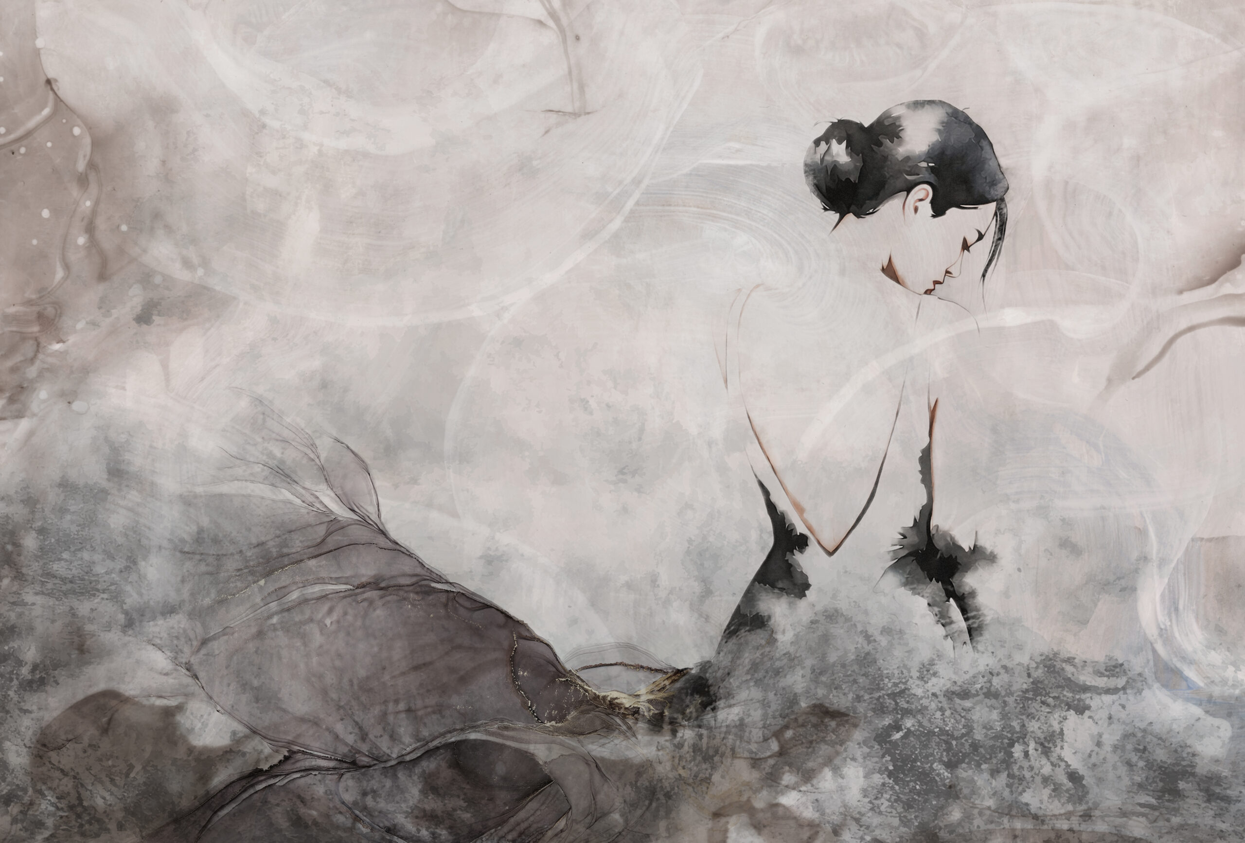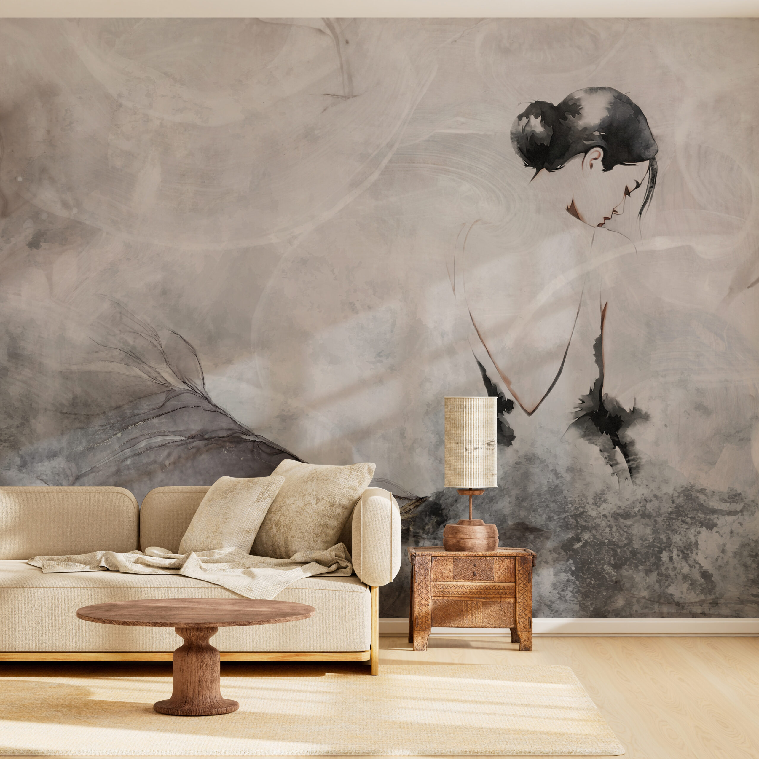 Odwrócona tyłem, tajemnicza i zamyślona kobieta w sukni zdaje się rozpływać na ścianie, tworząc efekt lekkości oraz subtelnej obecności. Fototapeta inspirowana tym motywem wpisuje się w nowoczesne trendy estetyczne, gdzie mniej znaczy więcej, a cisza oraz spokój stają się głównym przekazem.