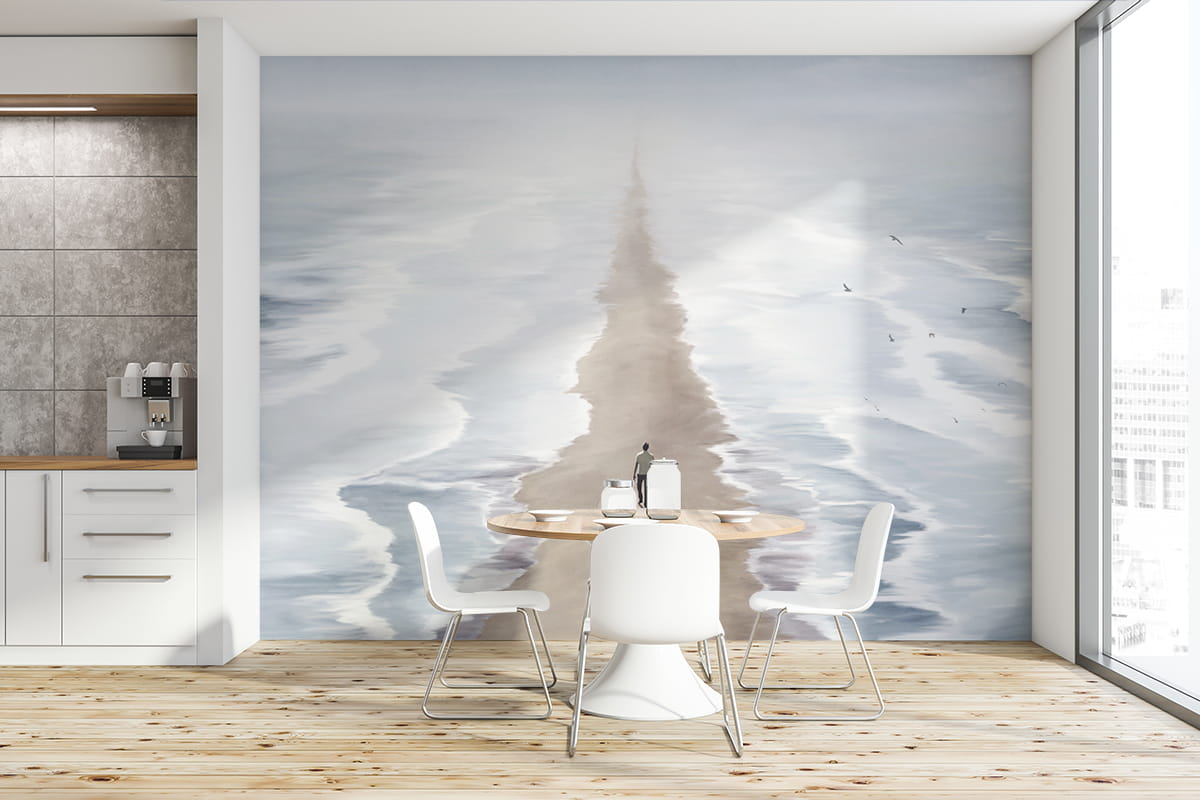 Wprowadź do wnętrza atmosferę wyciszenia i głębokiej harmonii dzięki fototapecie „Droga ku ciszy”. Delikatny pejzaż przedstawiający wąską ścieżkę prowadzącą przez spokojne wody ku jasnemu horyzontowi buduje poczucie nieskończoności i wewnętrznego spokoju. Centralna postać w oddali podkreśla motyw samotnej drogi, refleksji i świadomego zatrzymania się w biegu codzienności.