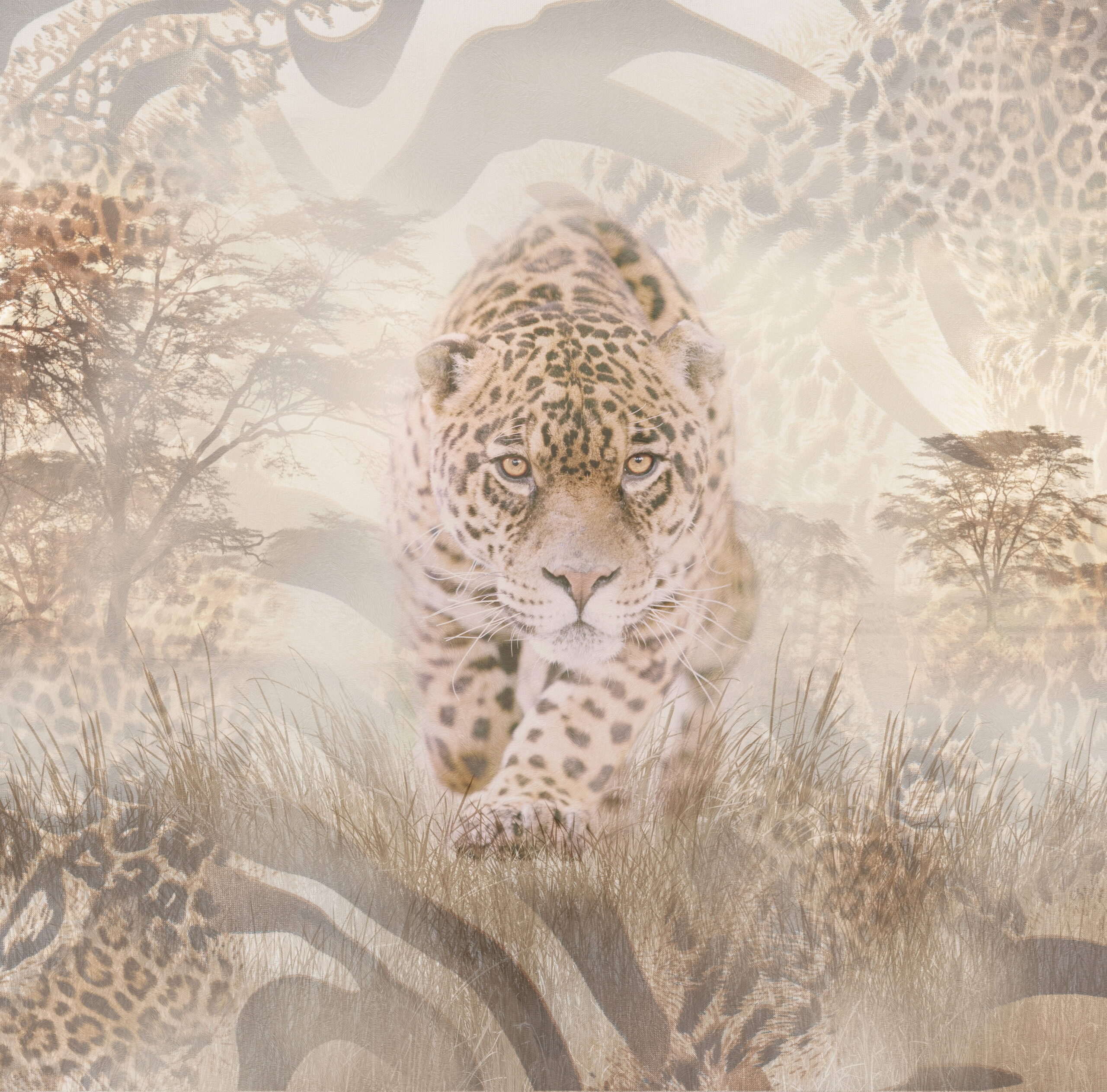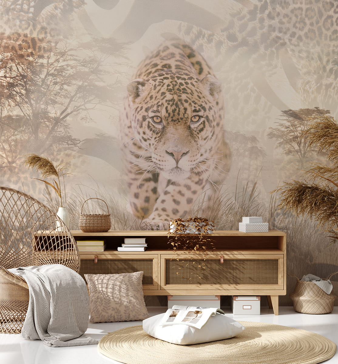 Wprowadź do swojego wnętrza niezwykłą atmosferę dzikiej natury dzięki fototapecie „Dzika elegancja sawanny”. Centralnym motywem jest majestatyczny lampart, którego spokojne, a jednocześnie przenikliwe spojrzenie symbolizuje siłę, niezależność i naturalną harmonię. Delikatnie przenikające się wzory inspirowane afrykańskim krajobrazem oraz subtelne motywy zwierzęce tworzą spójną, elegancką kompozycję o wyjątkowej głębi.
