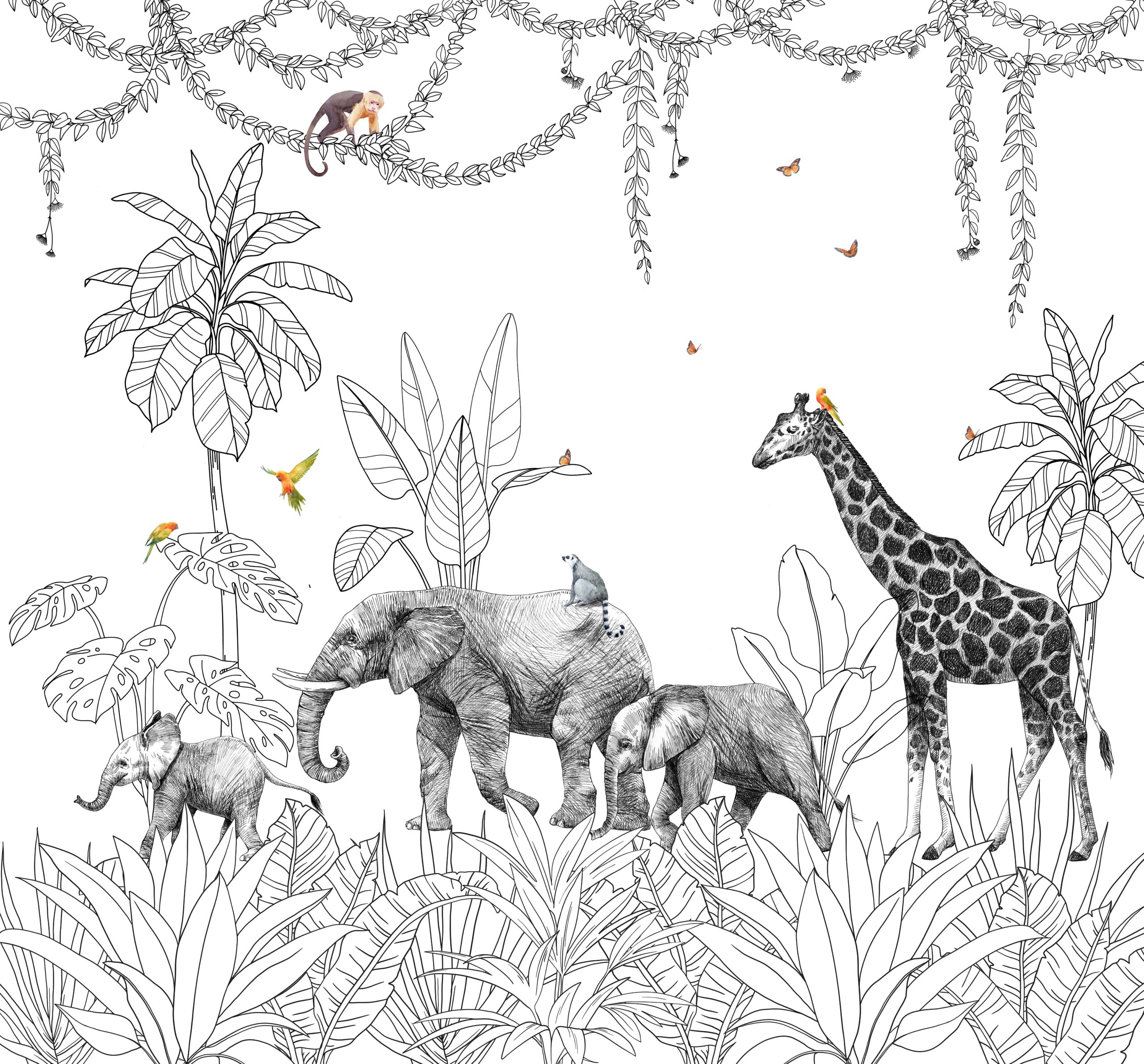 Zanurz się w niezwykły świat dzikiej natury dzięki fototapecie „Dżunglowa Harmonia”. Ta urokliwa ilustracja przedstawia wesołe zwierzęta, takie jak słonie, żyrafy i małpki, które w harmonii przemierzają tropikalną dżunglę pełną bujnych roślin i kolorowych ptaków. Połączenie delikatnych rysunków w czerni i bieli z akcentami intensywnych barw tworzy w przestrzeni ciepłą, pełną radości atmosferę.