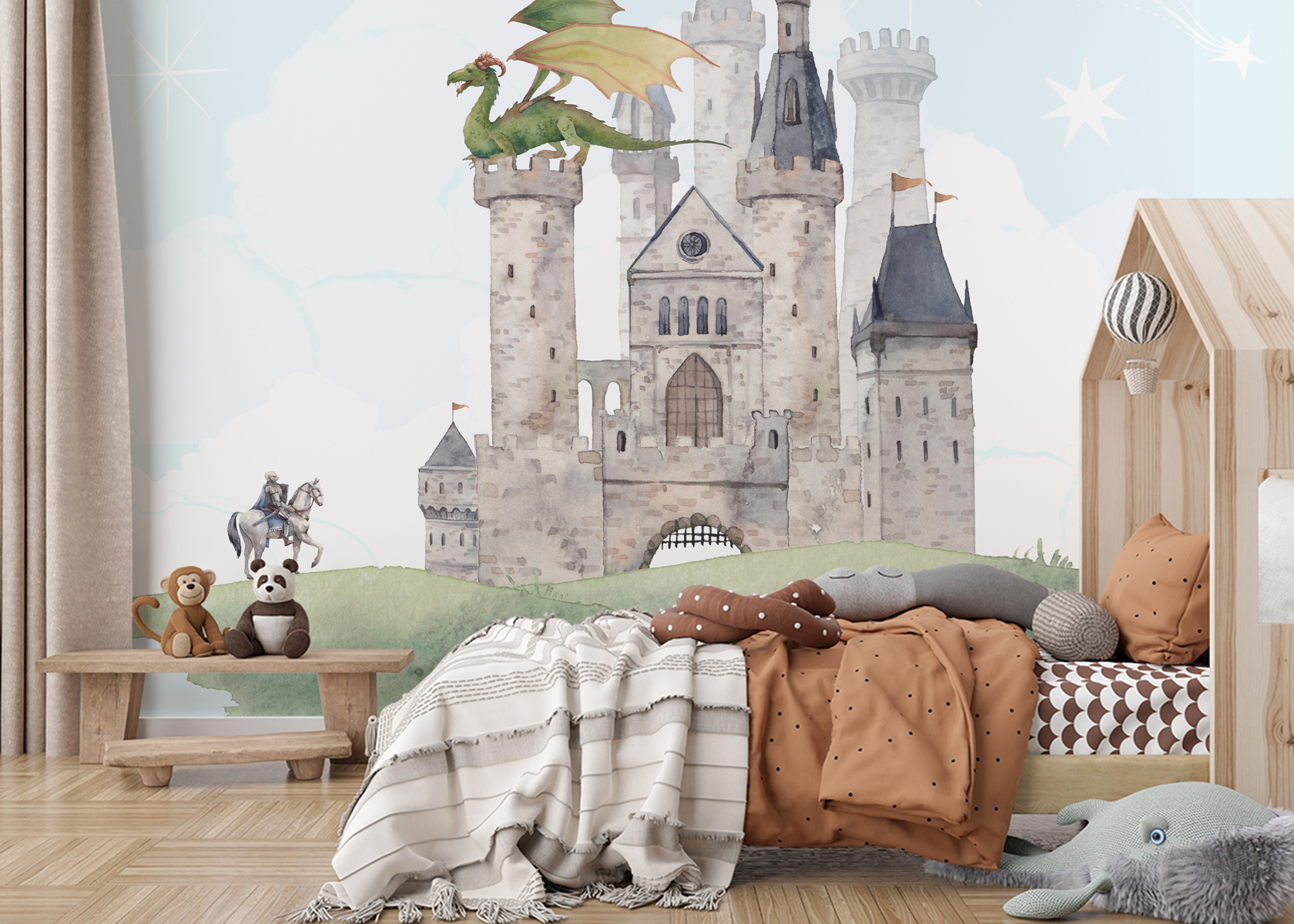 Jasna kolorystyka, pastelowe odcienie błękitu i zieleni oraz lekkie, ręcznie malowane detale sprawiają, że fototapeta zamek smok akwarela dla dzieci nie przytłacza przestrzeni, a jednocześnie pobudza wyobraźnię i kreatywność. Motyw bajkowego zamku sprzyja zabawie, opowiadaniu historii oraz tworzeniu własnych przygód.