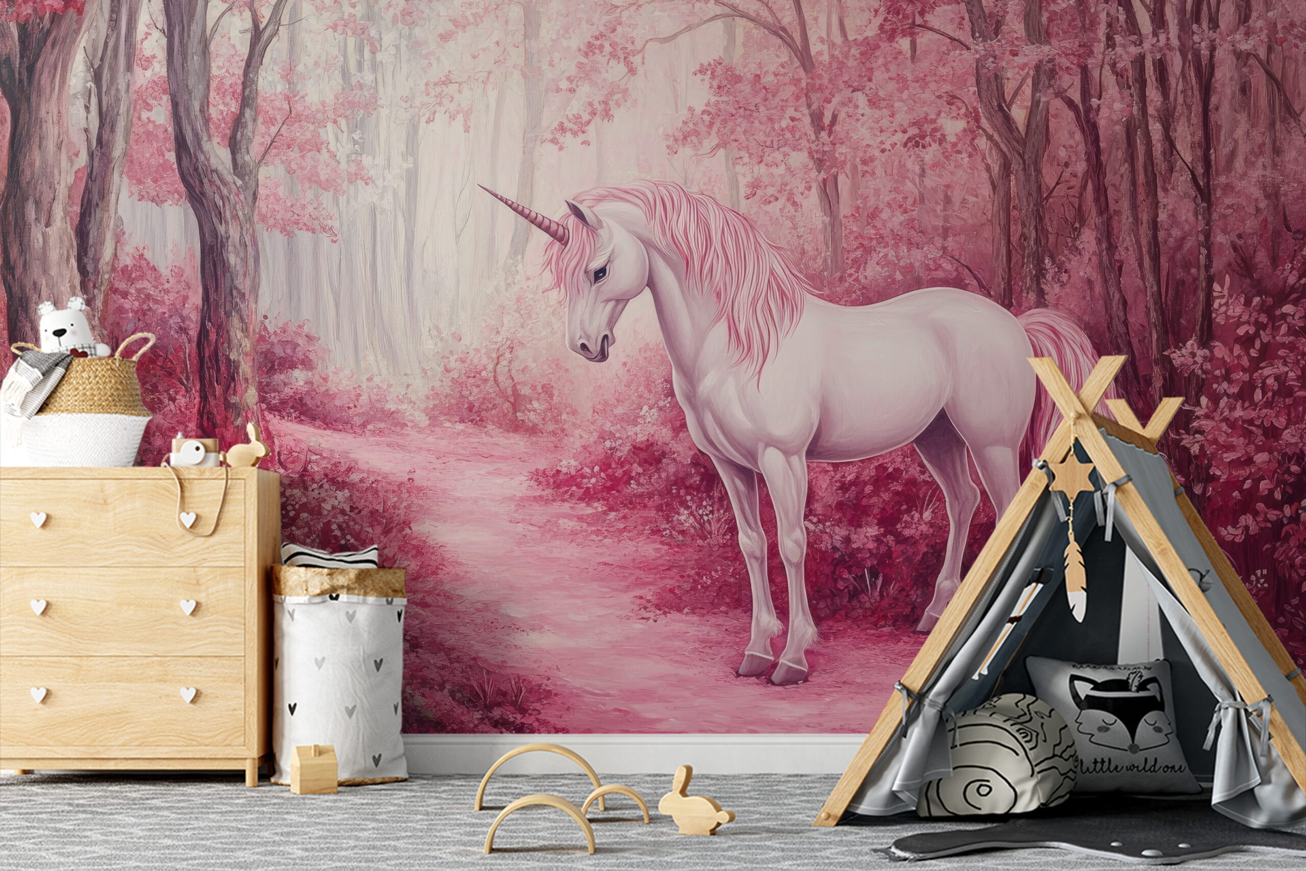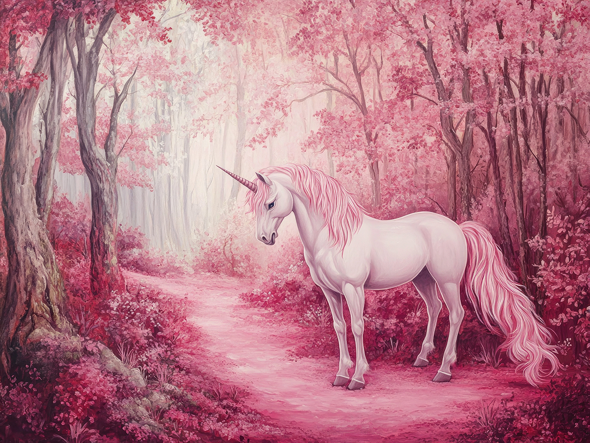 Przenieś się do świata wyobraźni dzięki fototapecie „Magiczny jednorożec”. Ilustracyjna scena przedstawia subtelnego, białego jednorożca na tle zaczarowanego lasu w odcieniach różu i pudrowej magenty. Miękkie światło, malarskie detale oraz harmonijna kolorystyka tworzą spokojną, niemal oniryczną atmosferę pełną lekkości i magii.