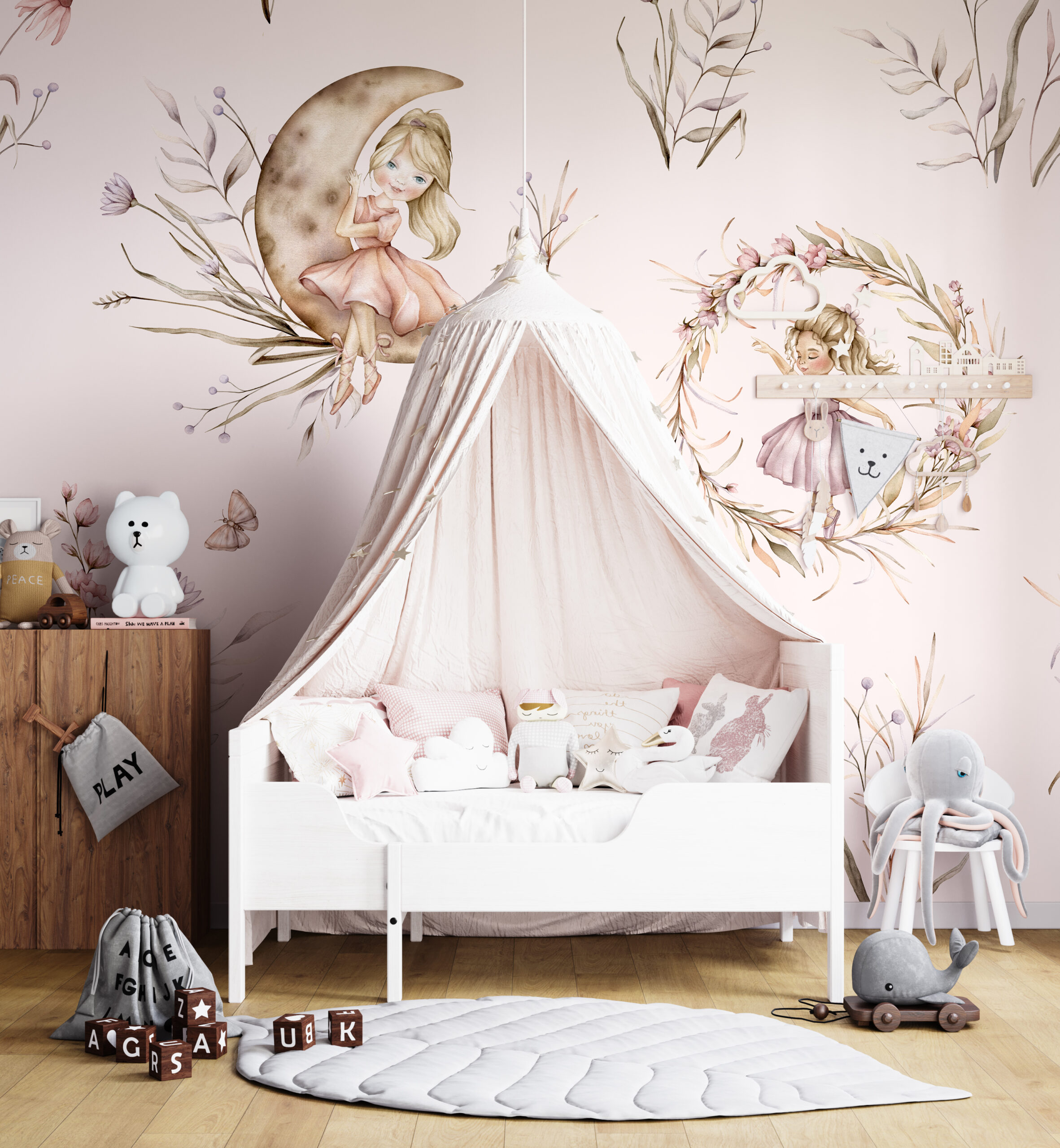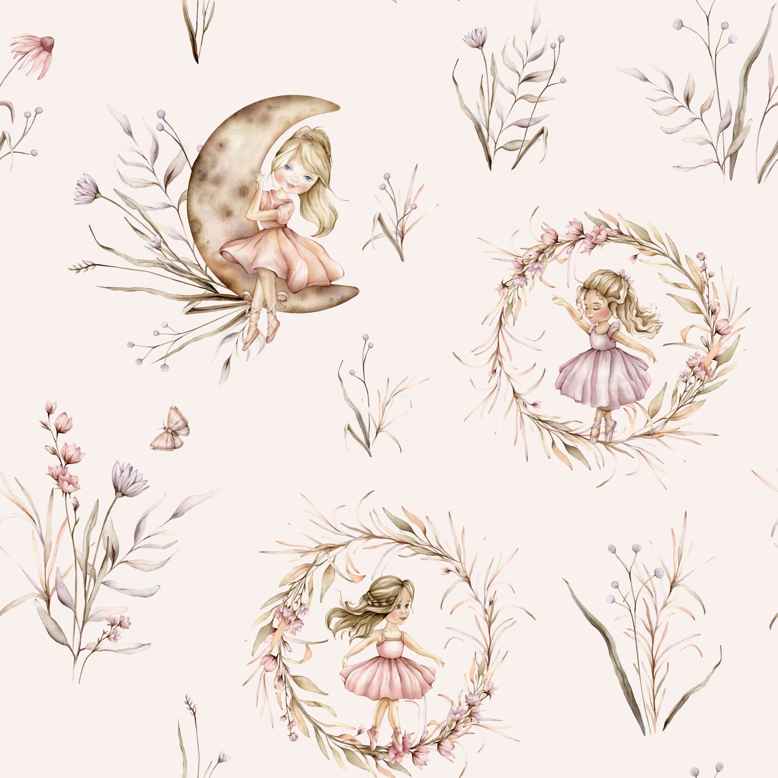 Fototapeta „Magiczny taniec pod księżycem” to wyjątkowa dekoracja ścienna, która przenosi do świata pełnego spokoju, magii i subtelnych emocji. Motyw przedstawia delikatne baletnice w otoczeniu kwiatów i księżyca, tworząc harmonijną, bajkową kompozycję idealną do pokoju dziecka.