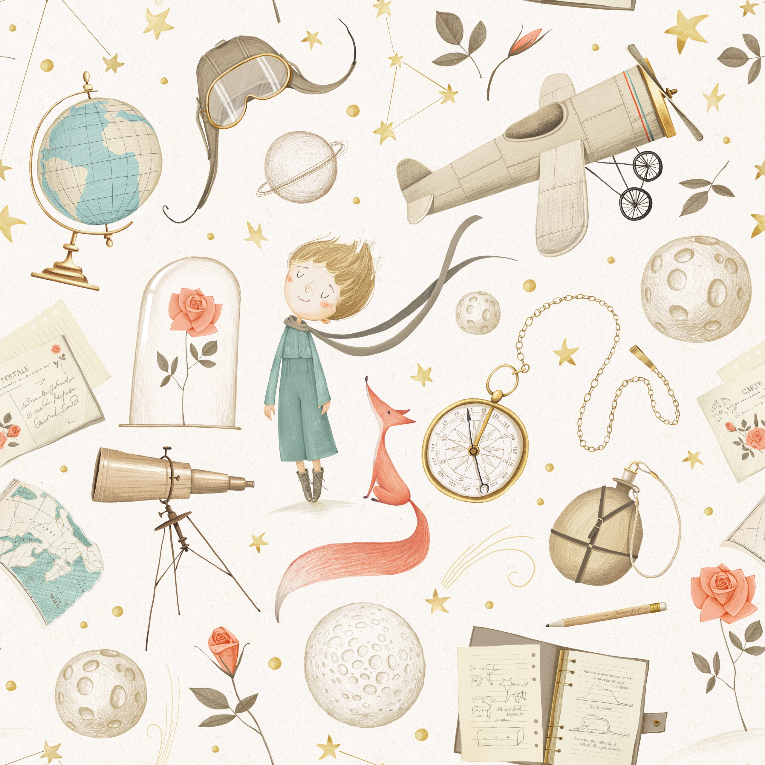 Motyw róży to jeden z najbardziej rozpoznawalnych elementów tej historii – symbol przywiązania, odpowiedzialności i wyjątkowej więzi. W połączeniu z postacią Małego Księcia oraz elementami kosmicznymi, takimi jak gwiazdy czy mała planeta, tworzy spokojną i refleksyjną kompozycję.