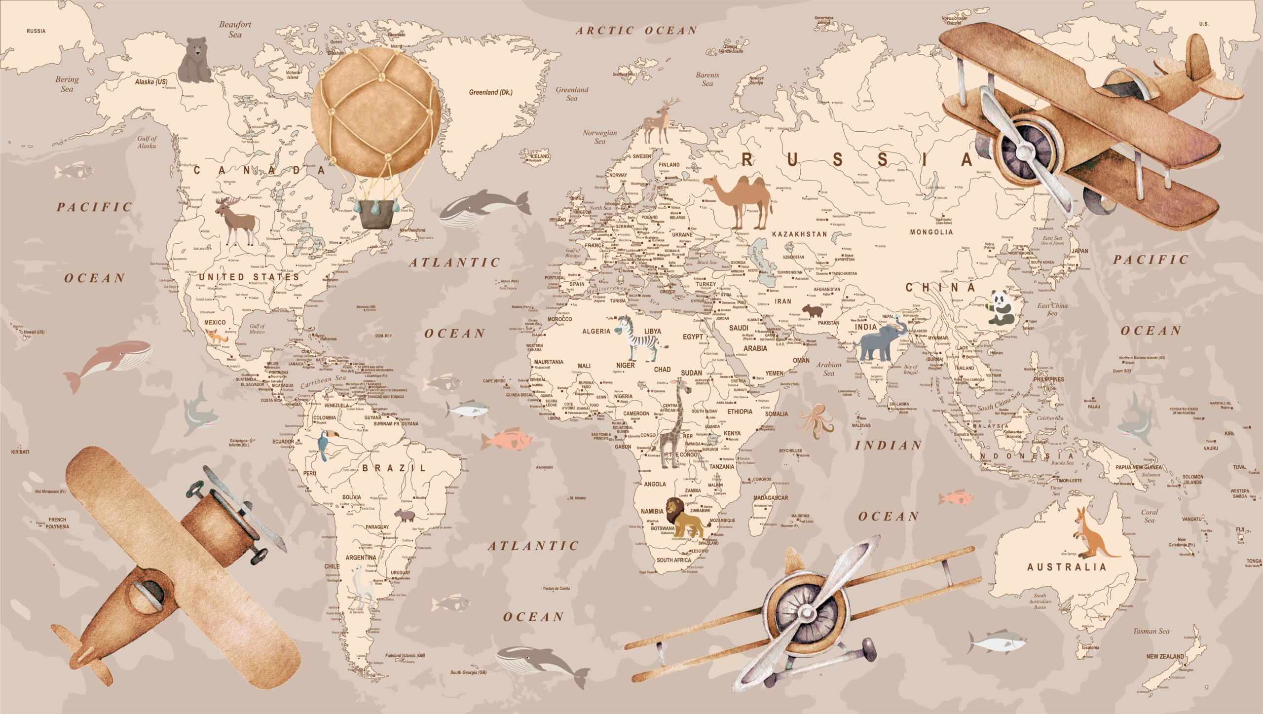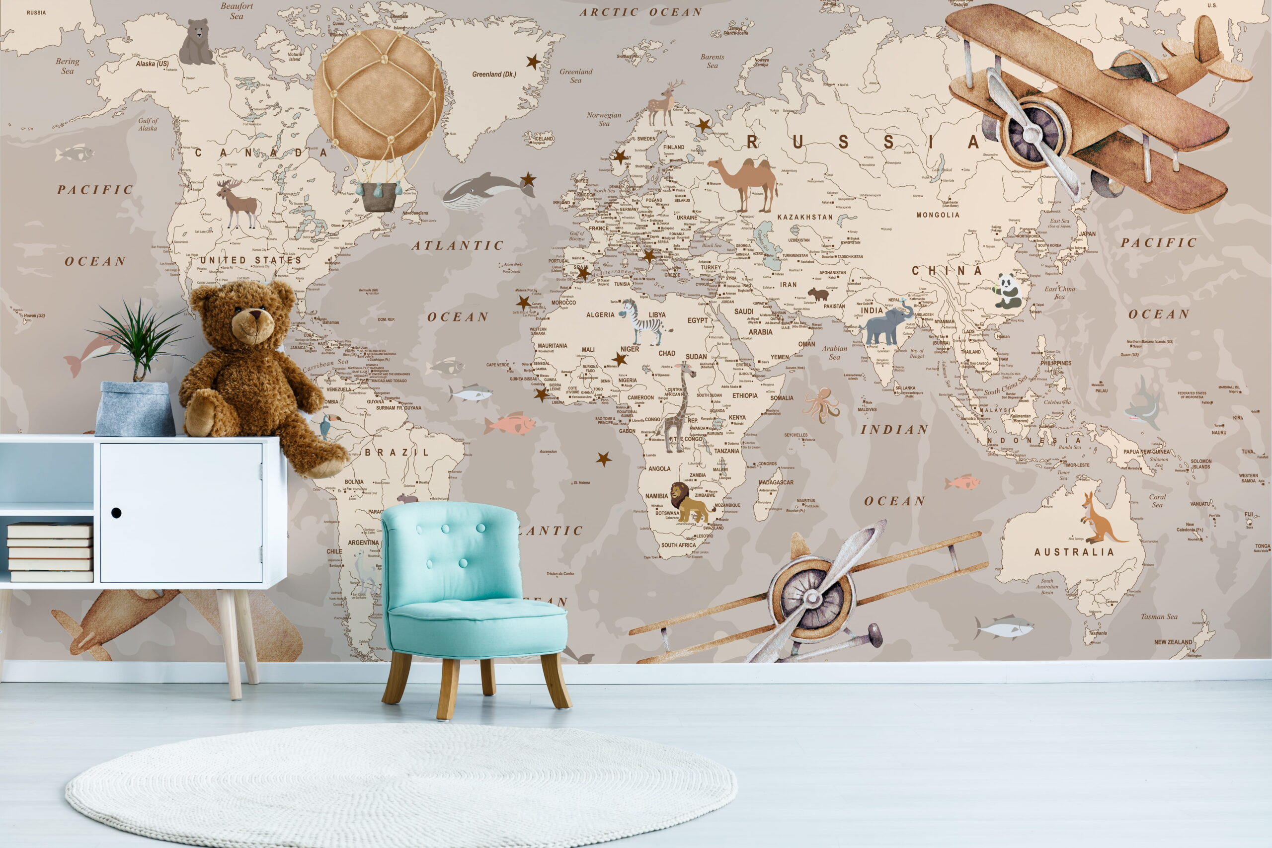 Subtelna, przygaszona kolorystyka inspirowana dawnymi mapami oraz delikatne detale – takie jak ilustracje zwierząt, kontynentów czy elementy podróżnicze – sprawiają, że fototapeta nie tylko zdobi wnętrze, ale także rozwija ciekawość świata. Tego typu mapy pomagają dzieciom poznawać geografię w naturalny i przystępny sposób