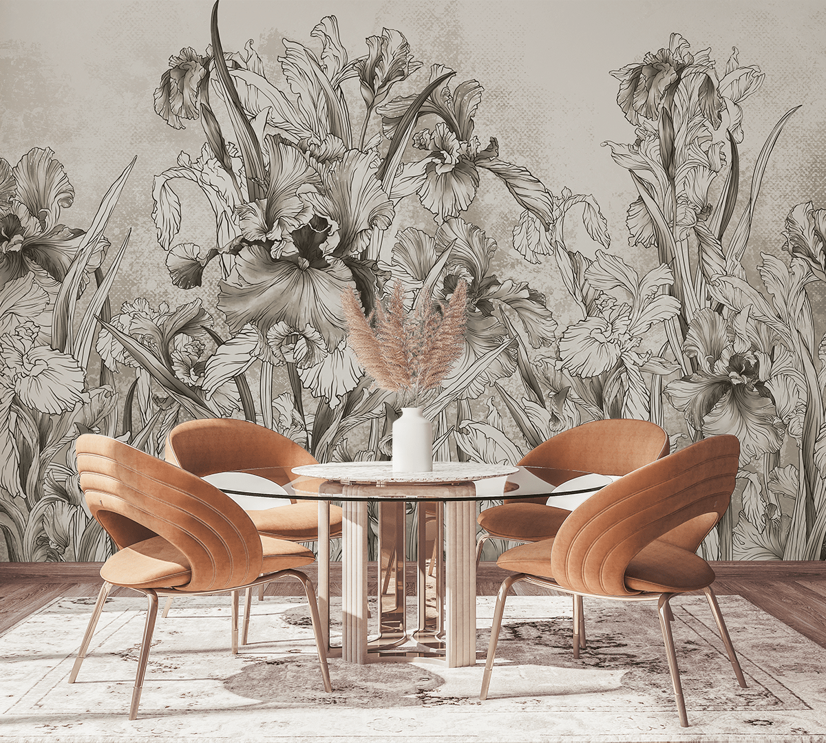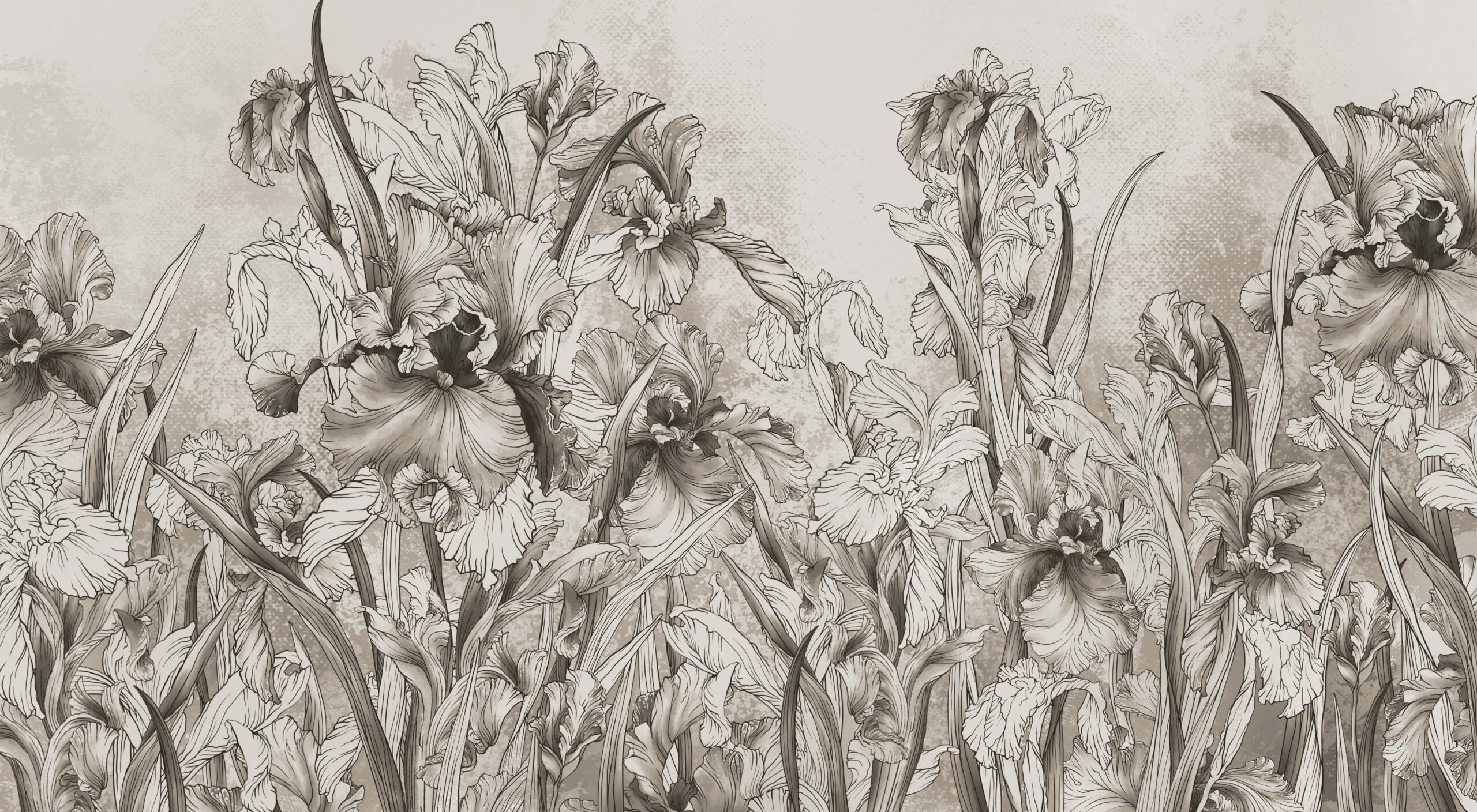 Fototapeta „Rysunkowe irysy w klasycznej odsłonie” – elegancja rysunku, subtelny vintage i dekoracyjna naturalność.