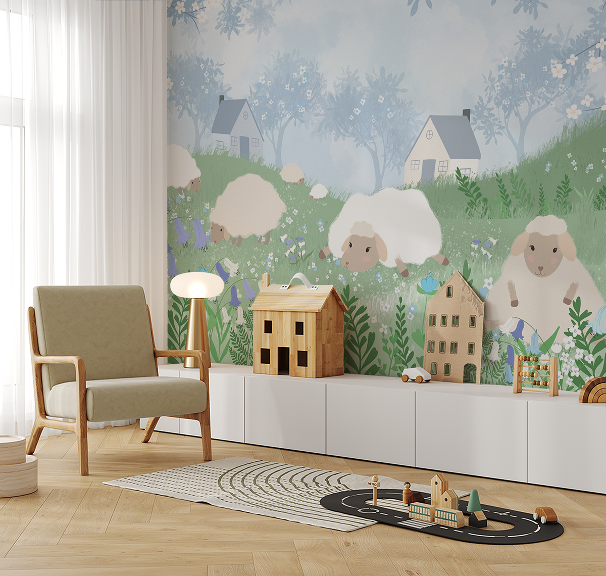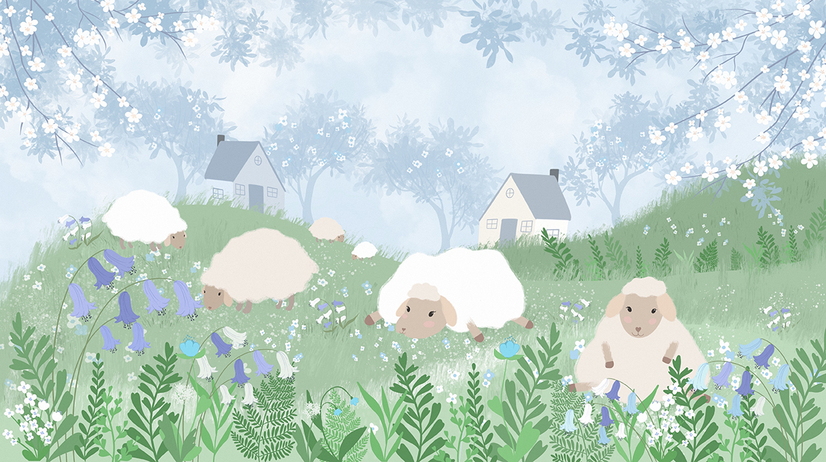 Motyw emanuje spokojem i niewinnością, przywołując skojarzenia z wiosennym krajobrazem i wiejską sielanką. Delikatne detale ilustracyjne oraz harmonijne zestawienie zieleni, błękitów i bieli sprawiają, że wzór jest przyjemny w odbiorze i nie przytłacza przestrzeni.