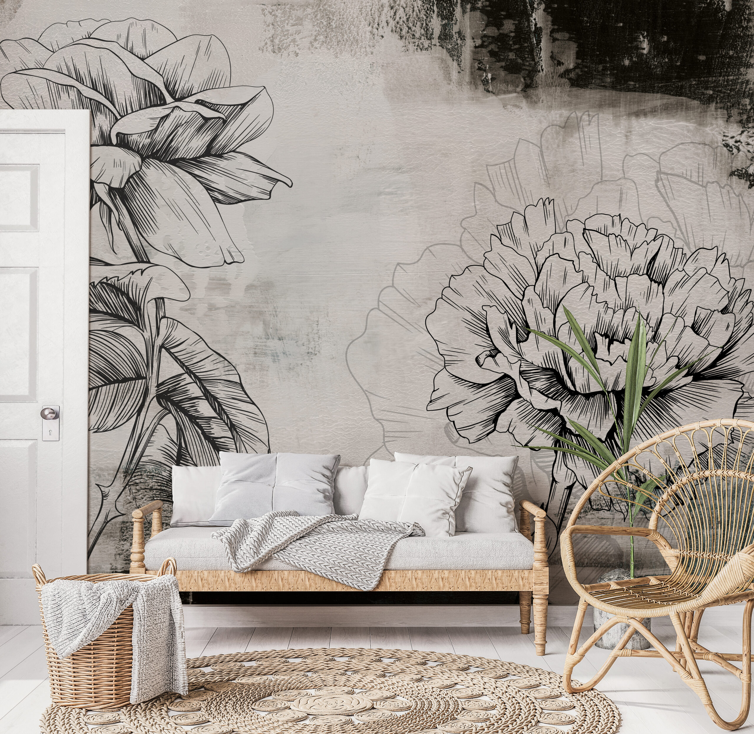 Monochromatyczna kolorystyka optycznie powiększa przestrzeń i dodaje jej lekkości, nie dominując wystroju. Szkicowa forma kwiatów nadaje wnętrzu unikalny charakter, wprowadzając nutę sztuki i harmonii. Fototapeta sprawdzi się w salonie, sypialni, gabinecie oraz w przestrzeniach komercyjnych, takich jak biura czy salony kosmetyczne. Doskonale podkreśla zarówno jasne, jak i ciemne aranżacje, tworząc spójną i stylową całość.