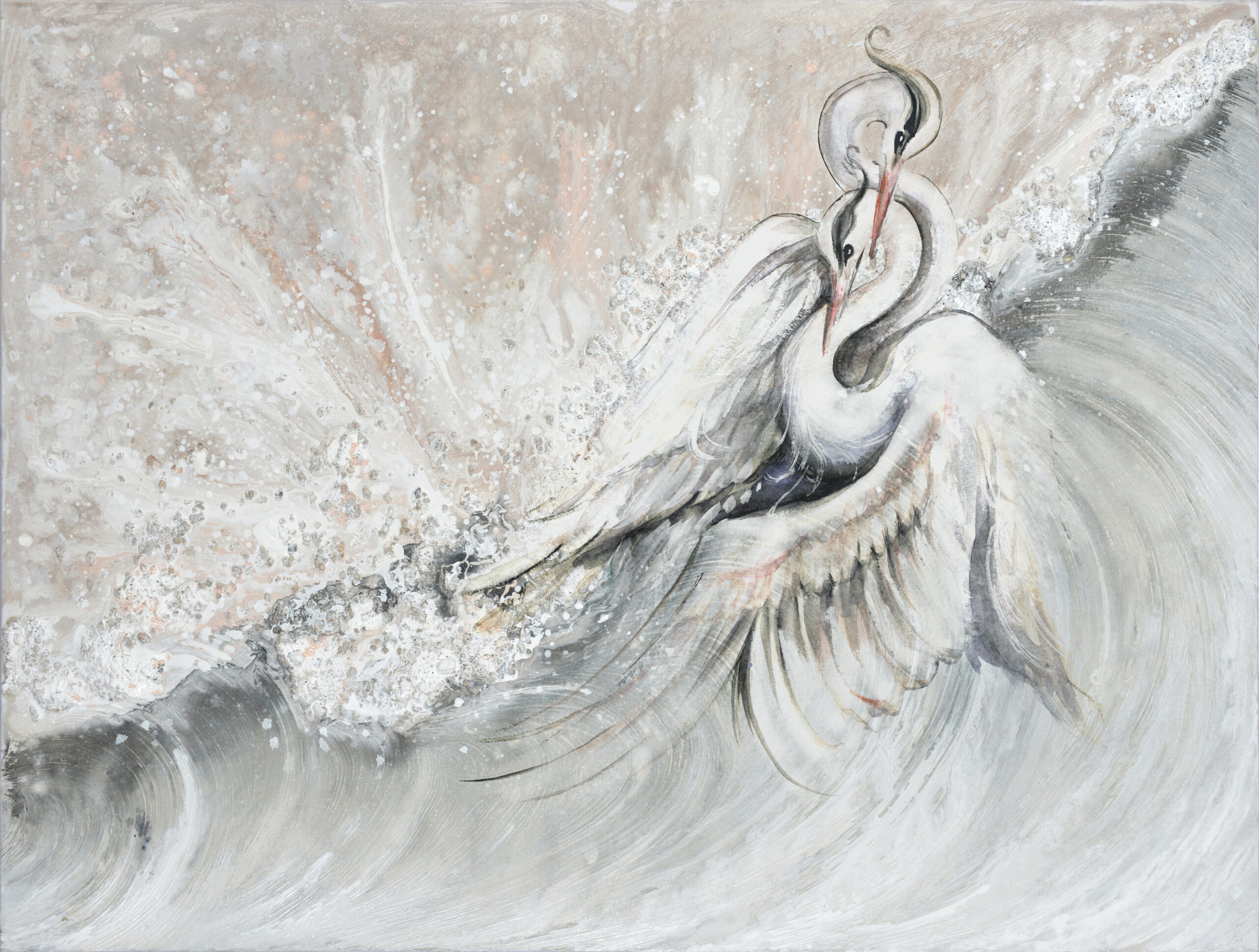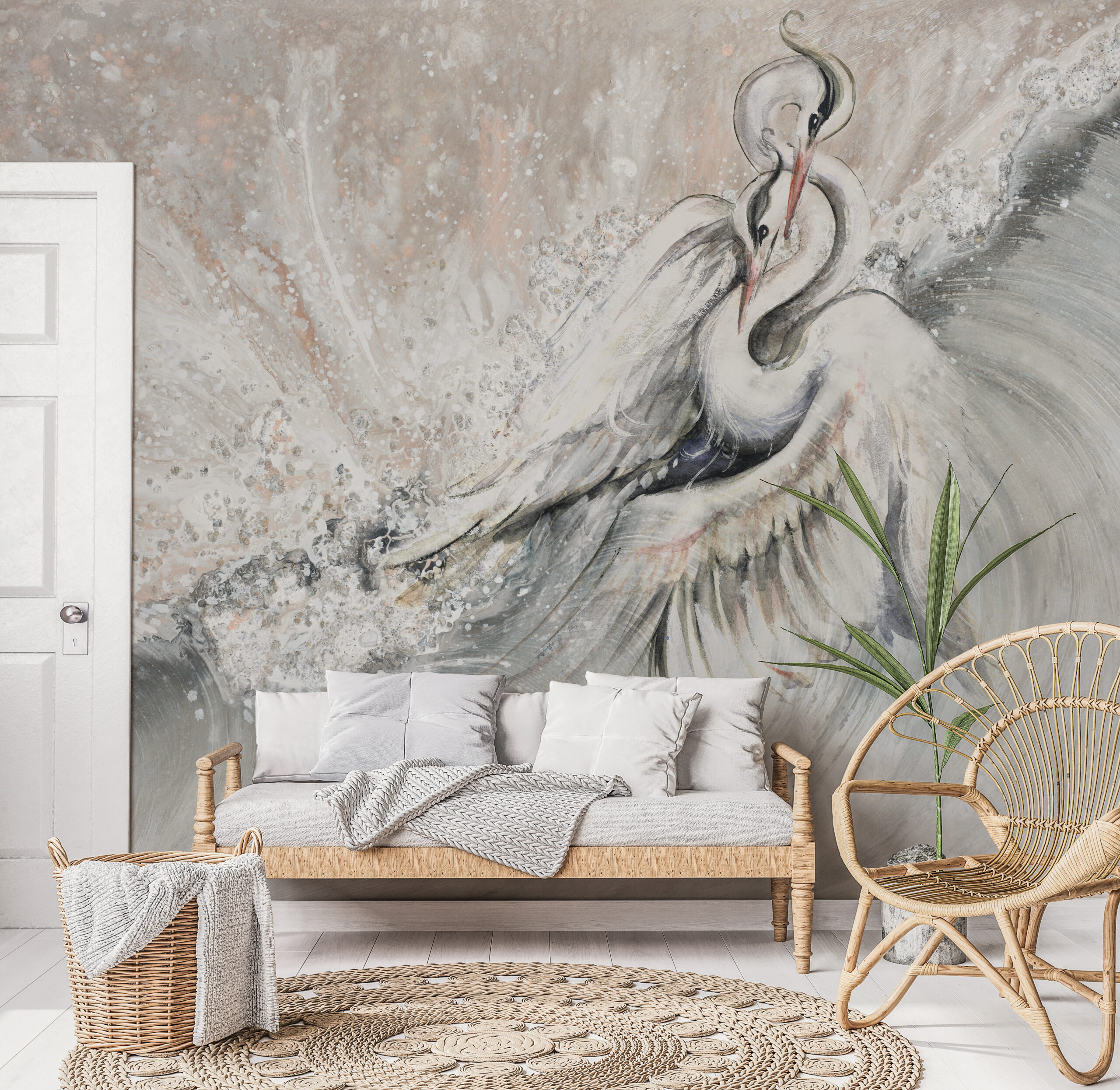 Wprowadź do swojego wnętrza poczucie ruchu i spokoju jednocześnie dzięki fototapecie „Taniec żurawi”. Artystyczna kompozycja przedstawiająca dwa żurawie unoszące się nad falującą wodą łączy w sobie lekkość, symbolikę natury oraz malarską ekspresję. Delikatna paleta barw, oparta na bielach, szarościach i subtelnych beżach, tworzy atmosferę wyciszenia i ponadczasowej estetyki.