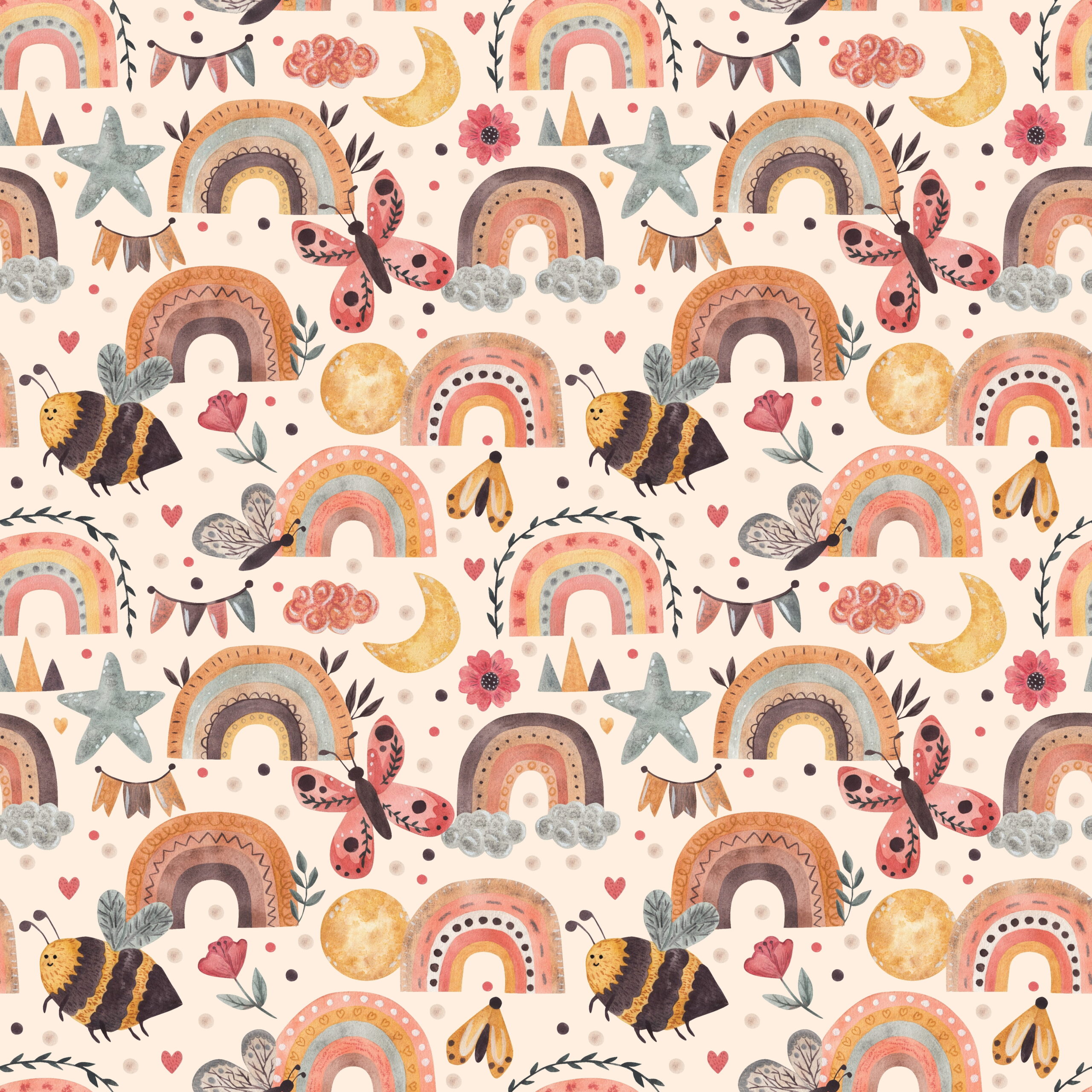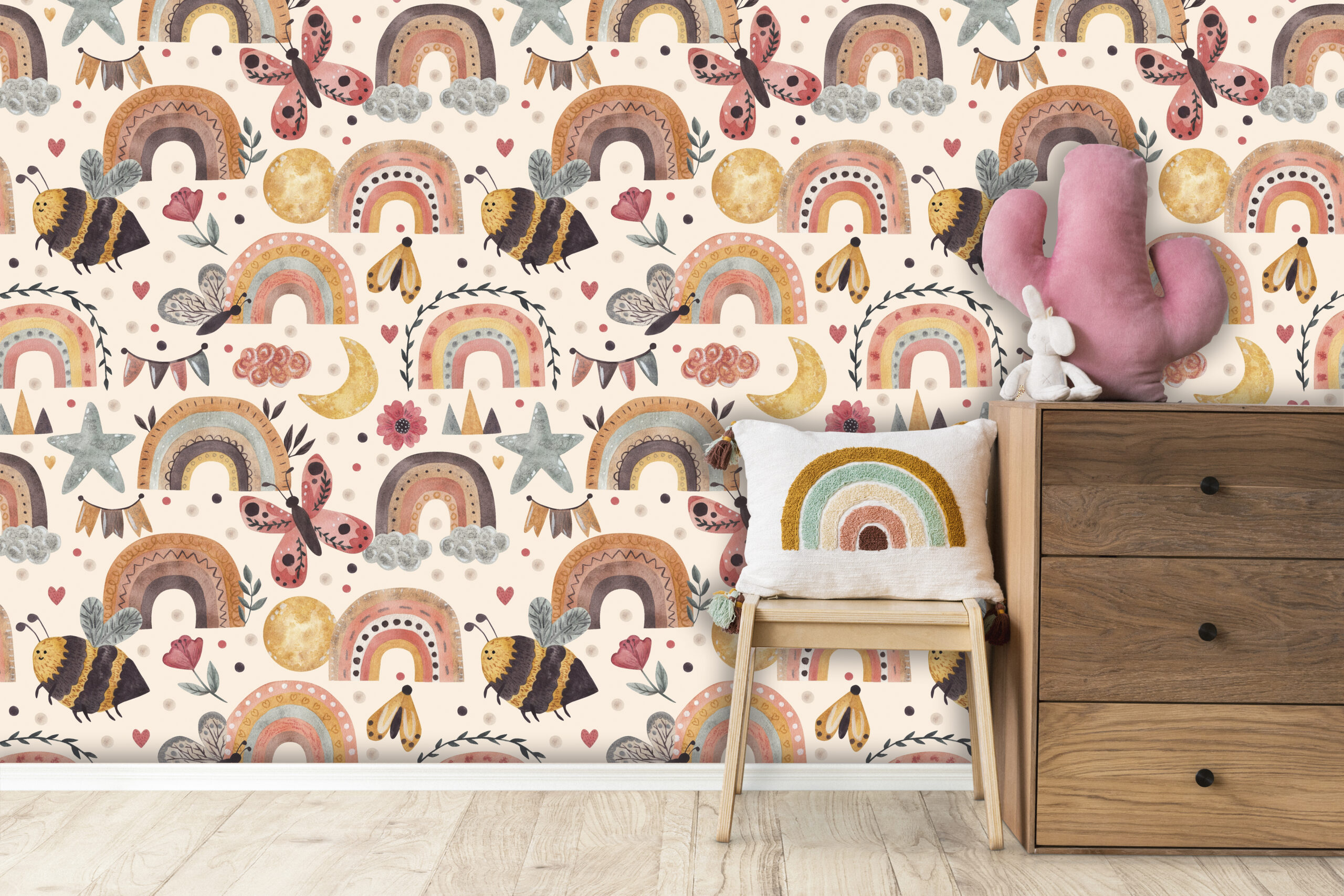 „Tęczowa Kraina” to wzór, który pobudza wyobraźnię i wprowadza pozytywny nastrój do każdego wnętrza. Delikatne przejścia kolorów, bajkowe elementy i lekka, ilustracyjna forma sprawiają, że ściana staje się centralnym punktem pokoju.