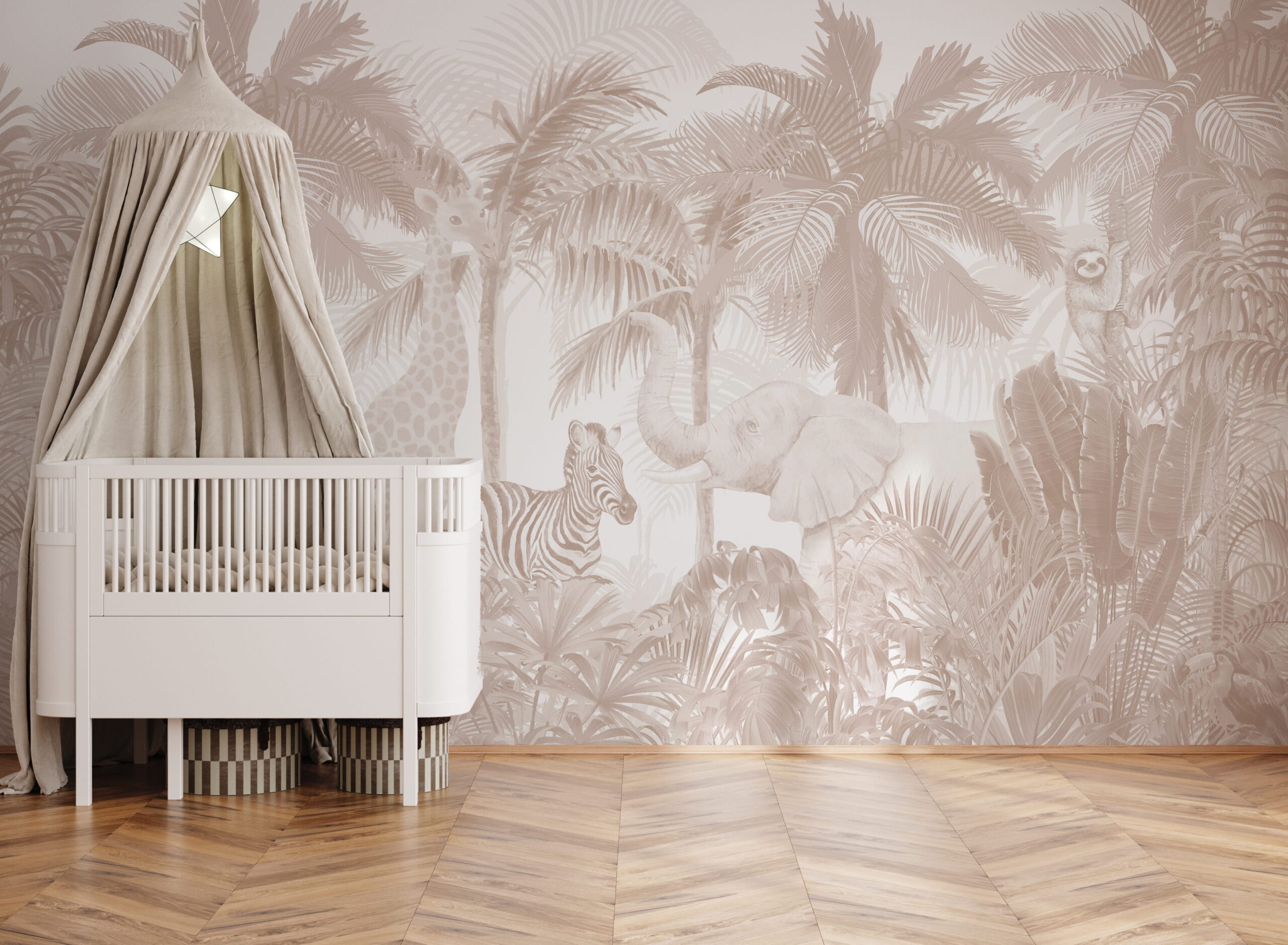 Przenieś się do świata subtelnej egzotyki dzięki fototapecie „Tropikalna cisza”. Ilustracyjna scena przedstawia tropikalną roślinność oraz dzikie zwierzęta ukryte wśród palm i liści, utrzymane w jednolitej, jasnej palecie beżów i pudrowych tonów. Delikatna kreska, miękkie przejścia tonalne i stonowana kolorystyka tworzą spokojną, harmonijną kompozycję o eleganckim i wyciszającym charakterze.