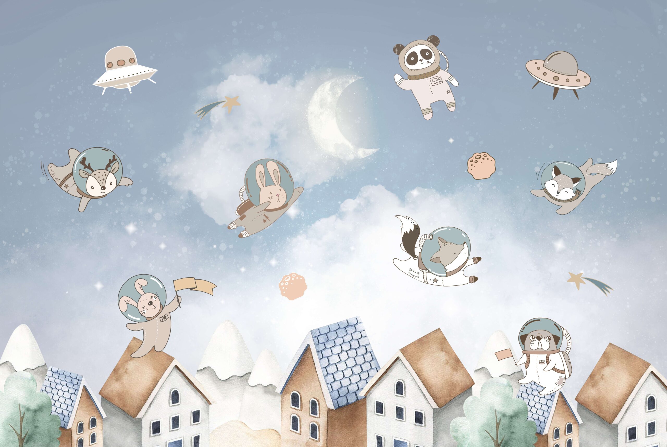 Fototapeta „Zwierzątka nad domkami” to urocza dekoracja ścienna, która przenosi dziecięcy pokój do świata wyobraźni i beztroskiej zabawy. Delikatna, pastelowa ilustracja przedstawiająca sympatyczne zwierzątka unoszące się nad kolorowymi domkami tworzy ciepłą, przyjazną atmosferę idealną dla najmłodszych.